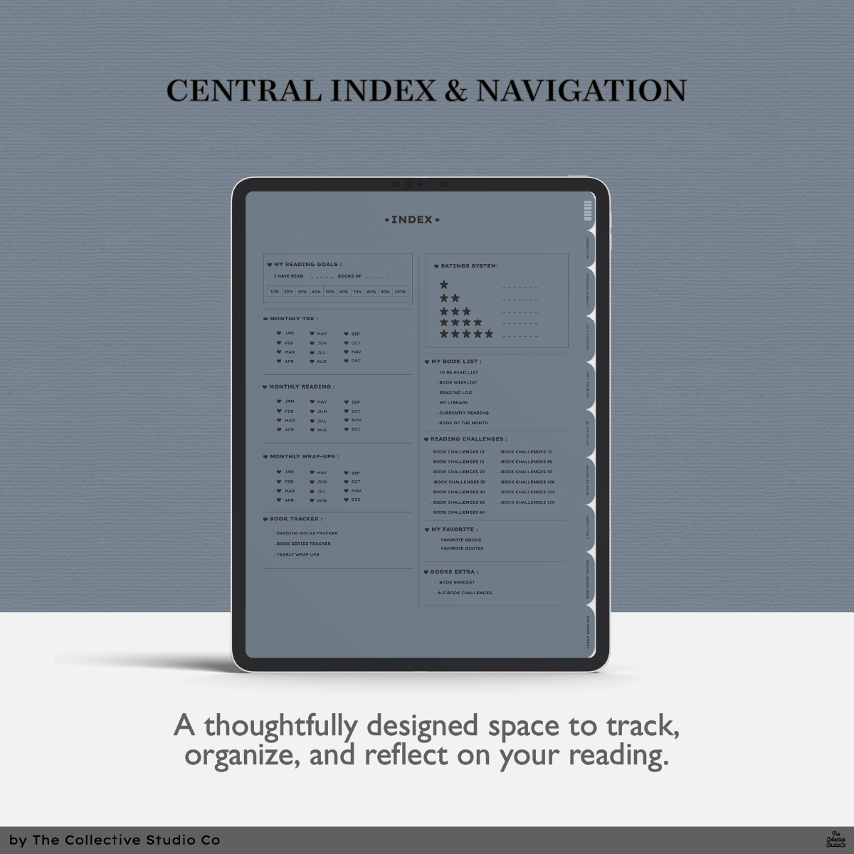 A 500+ page digital reading journal with hyperlinked tabs, smooth navigation, and spacious layouts — crafted for clarity, rhythm, and a calmer reading season.