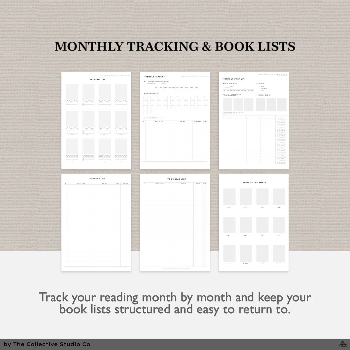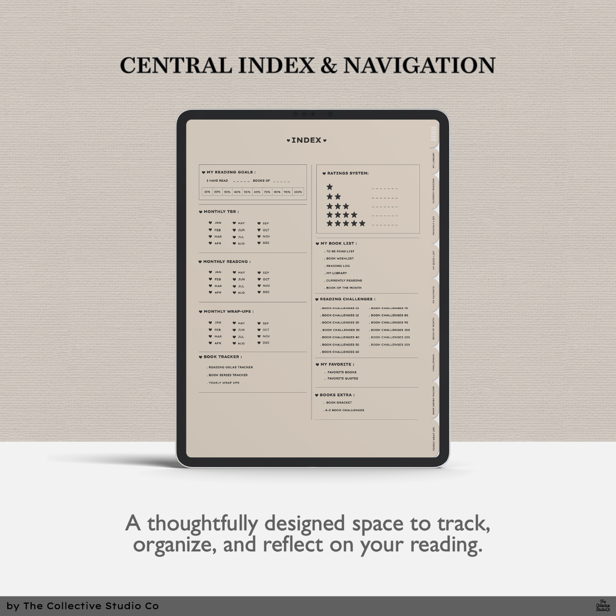 A 500+ page digital reading journal with hyperlinked tabs, smooth navigation, and spacious layouts — crafted for clarity, rhythm, and a calmer reading season.